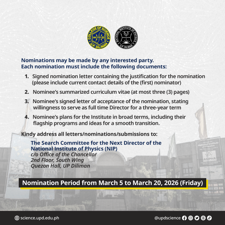 The Search Committee for the Next Director of the National Institute of Physics (NIP) is now accepting nominations from March 5, 2026 (Thursday) to March 20, 2026 (Friday)